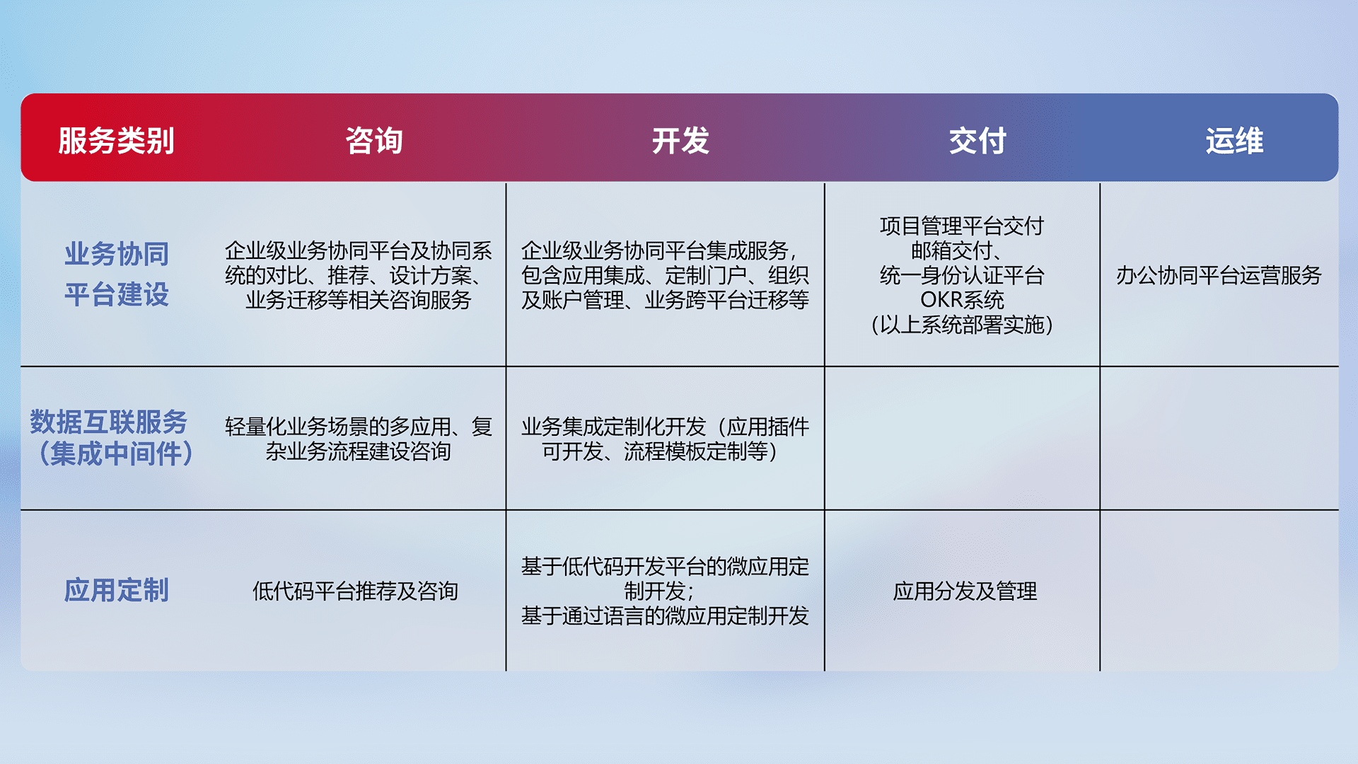 针对钉钉、、企微、、、IDaas等平台级产品提供产品的规划、、方案、、、、交付、、定制化开发等服务,,,实现如统一协同办公、、、智能客户服务、、、混合会议管理、、、智能数据查询、、、等业务场景,,,,实现数字化转型。。。。